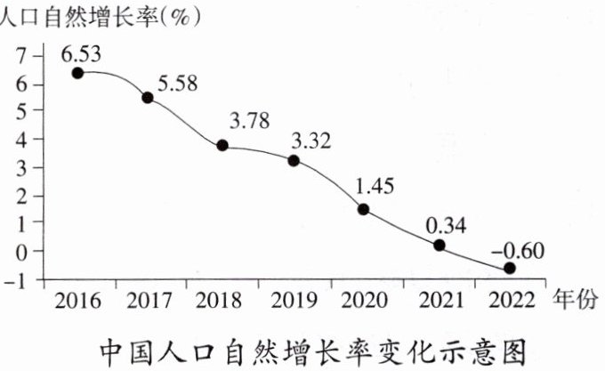 材料二 预计到2050年我国老年人口将达到全国人口的1/3,"银发潮"对经济发展产生深远影响。右图为"中国人口自然增长率变化示意图"。