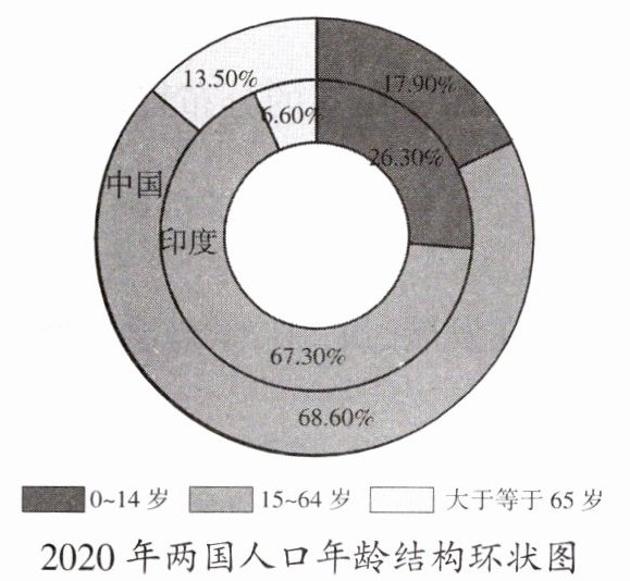 (2)印度0~14岁人口占总人口的26.3%,15~64岁人口占67.3%,65岁以上人口占6.6%;中国0~14岁人口占总人口的17.9%,15~64岁人口占68.6%,65岁以上人口占13.5%;印度0~14岁人口占总人口的比重更高,65岁以上人口占比更低。