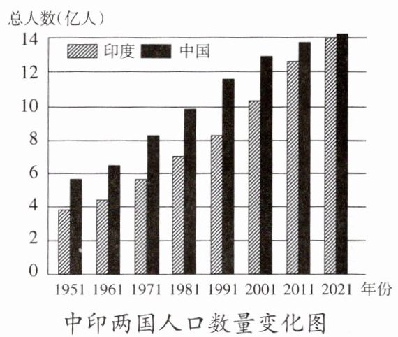 材料一 中国和印度都是世界人口大国。据联合国公布,2023年4月底,印度总人口超过中国,成为世界人口第一大国。下图为"中印两国人口数量变化图"和"2020年两国人口年龄结构环状图"。