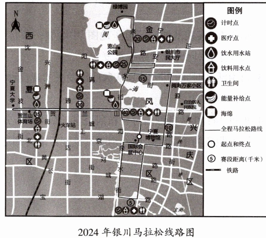 本届赛事从设计到比赛结束大量用到地图。地图是一种最基本、最常用的获取区域信息的工具。但是面对多种多样的地图,我们应该怎样阅读和使用它们,仍需要进一步探究。右图为“2024年银川马拉松线路图”。据此完成下列问题。
