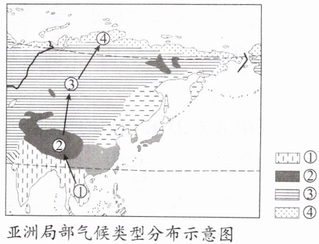右图为“亚洲局部气候类型分布图”。9 月至 10 月,某探险队沿图中①到④进行了为期一个多月的地理探险考察。据此完成 3~5 题。