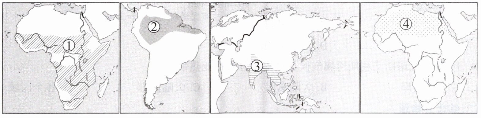 1. “在湿季,大草原一片葱绿,斑马、长颈鹿等动物成群结队迁徙而来,显得生机盎然。到了干季,满目枯黄,莽莽草原上,间或有一些耐旱的孤树……”这种景观所在的气候区对应图中的(