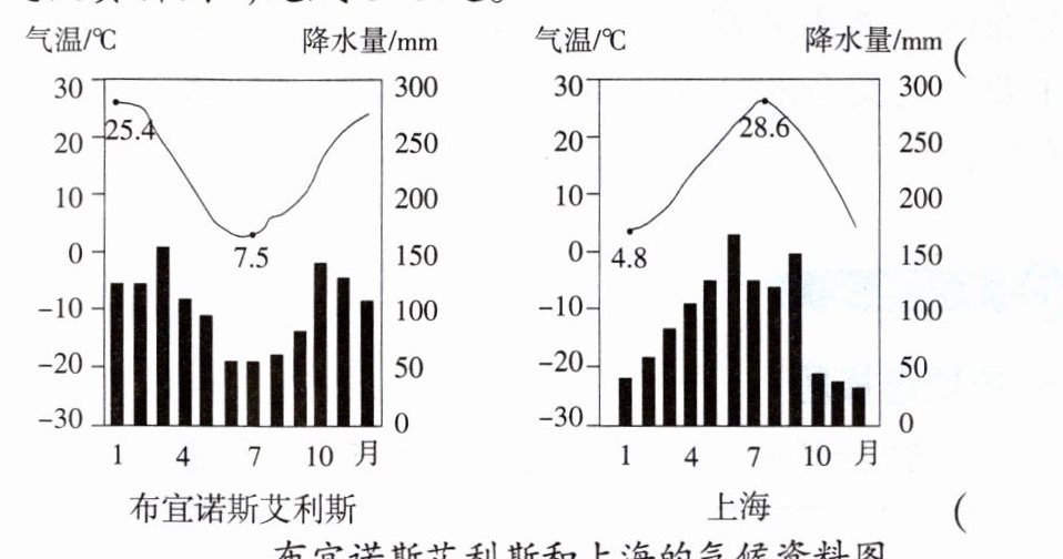 读“布宜诺斯艾利斯和上海的气候资料图”,完成 6~8 题。