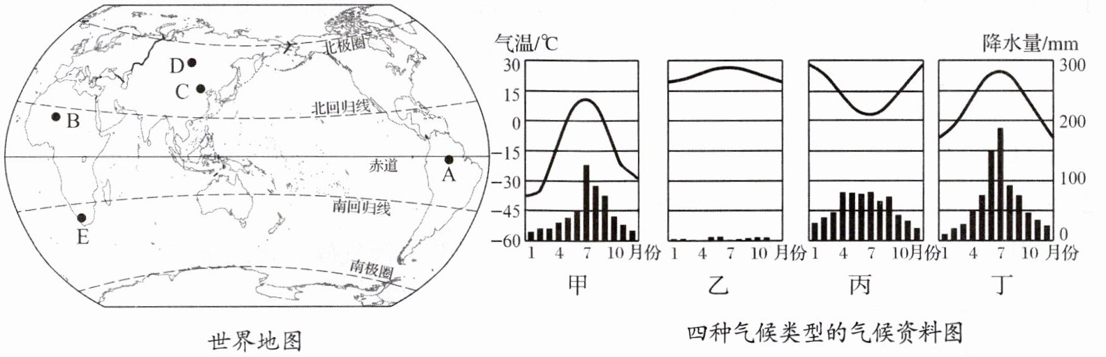 。(2)左图中 B、C、D、E 四地的气候类型与甲、乙、丙、丁的对应关系: