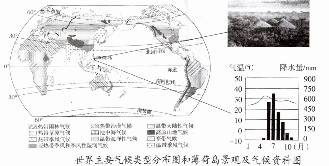 位于亚洲东南部的菲律宾薄荷岛中部丘陵上的草在雨季时为绿色,旱季时被炎热的太阳晒干变成咖啡色,酷似巧克力,因此得名“巧克力山”,下图为“世界主要气候类型分布图和薄荷岛景观及气候资料图”。据此完成 11~12 题。