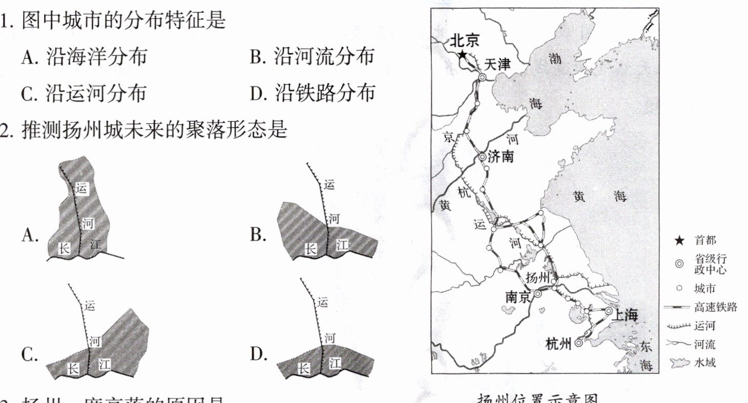 扬州南临长江,京杭运河纵贯南北,有“富甲天下”的美誉。曾是我国古代水陆交通中心,南北漕运的咽喉,东南第一大都会。清代中叶以后,随着大运河的淤积,扬州发展缓慢,甚至停滞。中华人民共和国成立后,随着大运河的大规模疏浚以及现代化陆路的发展,古城扬州又一次焕发了青春。下图为“扬州位置示意图”。据此完成1~4题。