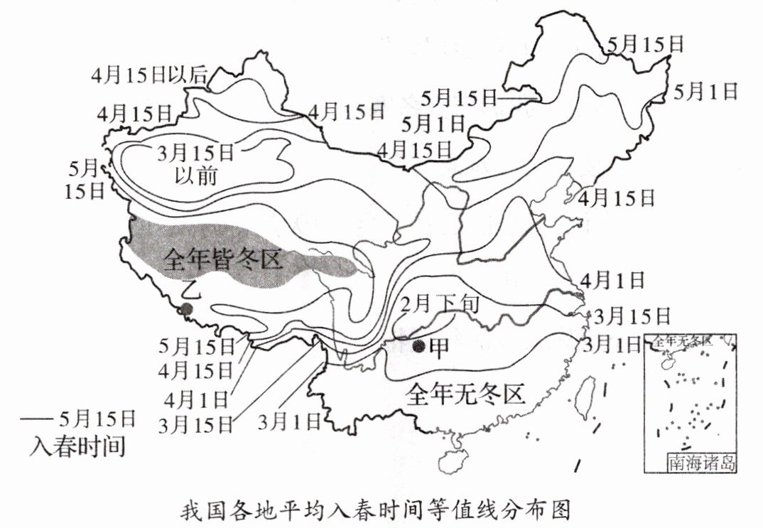 (2)试分析我国东部地区入春时间由南向北逐渐推迟的主要原因。