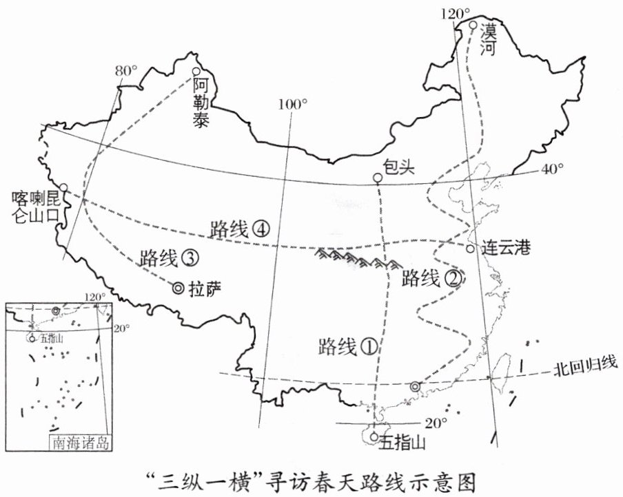 从南到北,从东到西,不知从哪天起,春的画卷如火如荼次第展开,转眼间就醉了大半个中国。下图是某地理社团策划的“三纵一横”寻访春天路线示意图。据此完成1-4题。