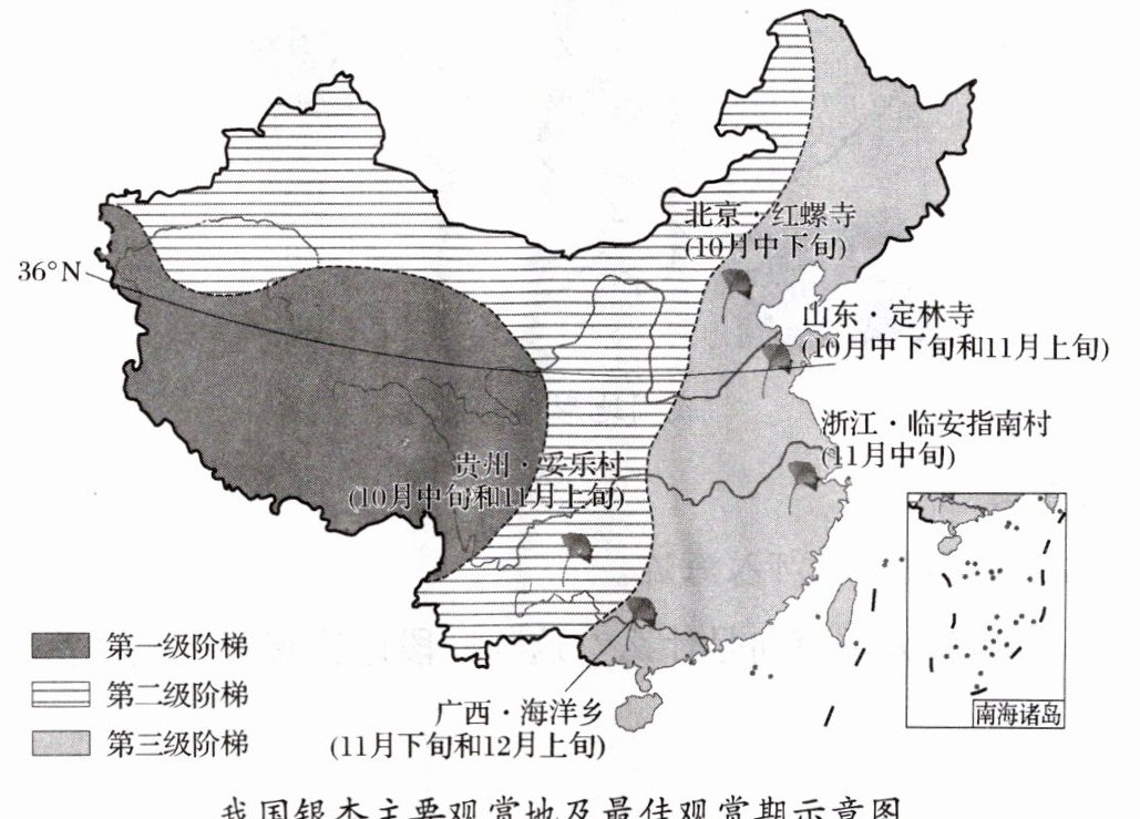 (2)贵州妥乐村(第二级阶梯)与广西海洋乡(第三级阶梯)纬度相近,但银杏变黄时间却不同。推测地形阶梯差异如何影响两地气温变化,并解释观赏期差异的原因。