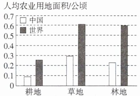 “民非谷不食,谷非地不生。”总书记习近平反复强调,要像保护大熊猫那样保护耕地,严防死守18亿亩耕地红线。读中国与世界的人均农业用地面积比较图,完成1-2题。