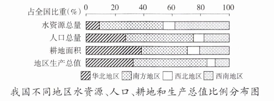 我国水资源分布不均、总量不足的问题突出,水安全形势严峻。读我国不同地区水资源、人口、耕地和生产总值比例分布图,完成3-5题。