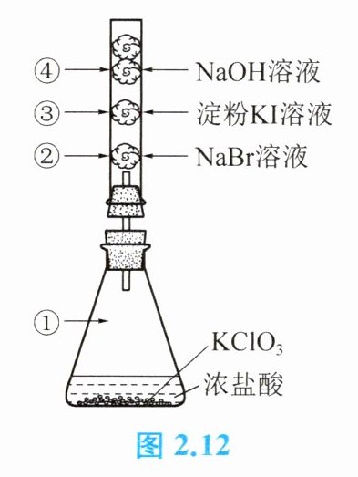 7. 已知常温下 ${KClO_{3}}$ 与浓盐酸反应生成 ${Cl_{2}}$、${KCl}$ 和 ${H_{2}O}$。如图 2.12 所示,进行关于卤素性质的实验。玻璃管内装有滴有不同溶液的棉球。请写出反应一段时间后图中指定部位的颜色,并分析原因。