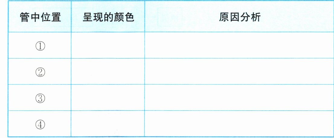 7.①黄绿色 $\mathrm{KClO_3}$与浓盐酸反应产生黄绿色的$\mathrm{Cl_2}$ ②橙色 $\mathrm{Cl_2}$与$\mathrm{NaBr}$溶液反应生成溴水 ③蓝色 $\mathrm{Cl_2}$与$\mathrm{NaI}$溶液反应生成$\mathrm{I_2}$,$\mathrm{I_2}$遇淀粉变蓝色 ④白色 黄绿色的$\mathrm{Cl_2}$被$\mathrm{NaOH}$溶液吸收了