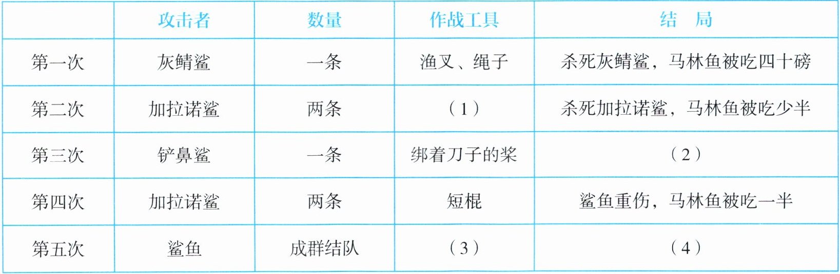 (1)棍子、舵柄 (2)杀死铲鼻鲨,马林鱼被吃很多 (3)短棍、舵柄 (4)马林鱼只剩一副骨架