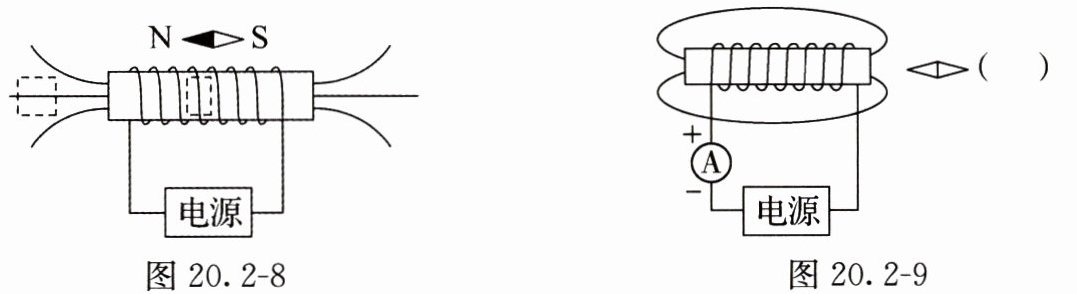 6. 如图20.2-8所示,请根据通电螺线管上方小磁针静止时的指向,在虚线框内用箭头标出相应导线中的电流方向和相应位置的磁场方向。