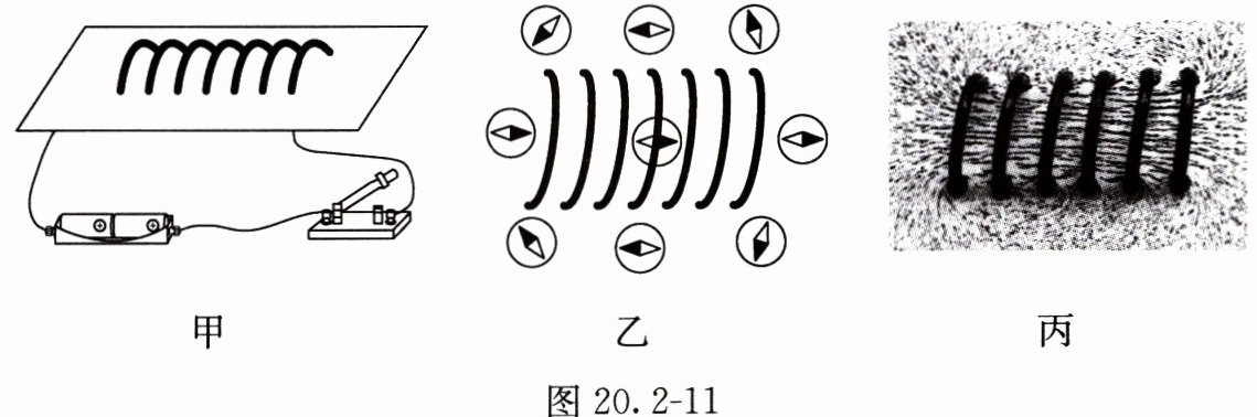 9. 小明想研究通电螺线管外部磁场的分布情况,他组装了如图20.2-11甲所示的电路,然后在螺线管周围放置了一些小磁针,闭合开关后,小磁针的指向如图20.2-11乙所示(小磁针黑色的一端为N极);将小磁针拿掉之后,在硬板上均匀地撒上一些铁屑,闭合开关后轻轻敲打硬板,可以看到铁屑的分布情况如图20.2-11丙所示。