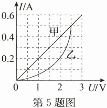 5. 两个导体甲和乙的 $I - U$ 图像如图所示,若将甲、乙串联接入电路,电路的总电压为 $3 V$,则乙的电阻是______$\Omega$;若将甲、乙并联接入电路,总电流为 $0.6 A$,则电源电压为______$V$。