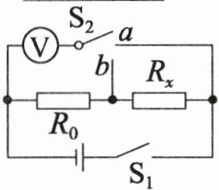 7. 如图所示的电路中,一个定值电阻的电阻$R_{0}$为 $12 \Omega$。闭合开关 $S_{1}$,将单刀双掷开关 $S_{2}$ 掷于 $a$ 端,电压表示数为 $2.5 V$;将 $S_{2}$ 切换到 $b$ 端,电压表示数为 $1.5 V$,则另一个定值电阻的电阻$R_{x}$ 为______$\Omega$。