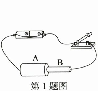 1. A、B 是由同种材料制成的长度相同、横截面积不同的两段导体,如图所示,将它们串联后接入电路中,闭合开关后,$I_{A}$______$I_{B}$,$U_{A}$______$U_{B}$。(均选填“$>$”“$<$”或“$=$”)