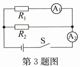 3. 如图所示,电源电压保持不变,一个定值电阻的电阻$R_{1}$为 $15 \Omega$,闭合开关 S,电流表$A_{1}$的示数为 $0.8 A$,电流表$A_{2}$的示数为 $1.2 A$,则电阻$R_{2}$为______$\Omega$。