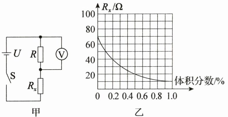 8. 小华设计的天然气体积分数测试仪电路如图甲所示,电源电压 $U$ 恒为 $4 V$,定值电阻的电阻为 $R$,电压表的测量范围为 $0 \sim 3 V$,将电压表作为天然气体积分数的显示装置。气敏电阻的电阻$R_{x}$ 与天然气体积分数的关系如图乙所示。要求将电压表示数为 $1.5 V$ 处标为体积分数 $0.5 \%$,则定值电阻的电阻 $R$ 应为______$\Omega$。