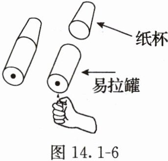13.(多选)如图14.1-6所示,将一个空易拉罐的底部钻一个小孔,往易拉罐里喷少量酒精,然后将一个空的纸杯迅速套在易拉罐上,用手拿着这个简易的“冲天炮”,将易拉罐底部的小孔对准点燃的打火机,纸杯就会像“冲天炮”一样飞出去。下列说法正确的是(