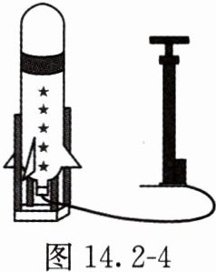 4. 如图14.2-4所示,将“气压火箭”发射筒内充满气体,并在发射筒外安装好纸火箭外壳。按下发射气阀,随着“砰”的一声响,火箭飞出,同时看到下端管口出现明显的“白气”。发射筒内气体对筒身与纸火箭做功,内能