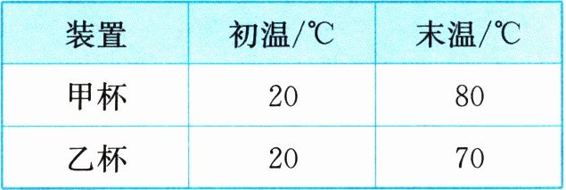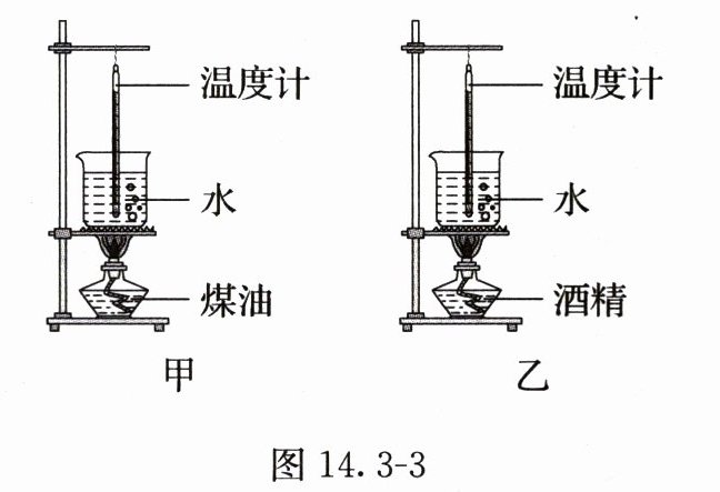14. 小涵学习了关于燃料热值的知识后,自己设计了一个实验来研究煤油和酒精热值的大小关系。他组装了如图 14.3 - 3 所示的两套完全相同的装置,燃烧了质量相等的煤油和酒精,加热两个烧杯中质量相等的水,并记录了杯中水的初温和末温(如下表所示)。