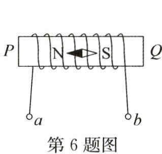 6. 通电螺线管内有一个在磁场作用下处于静止状态的小磁针,小磁针指向如图所示,则导线的$a$端接电源的______极;若把通电螺线管用一根细线悬挂起来,则螺线管静止时$Q$端指向地理______(选填“南”或“北”)极附近。