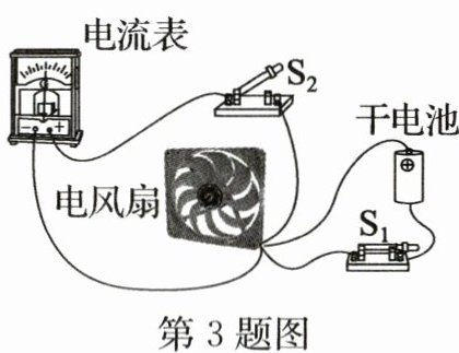 3. 将电风扇(内部有磁铁和线圈)、干电池和电流表等按如图所示的电路连接。当$S_{2}$断开、$S_{1}$闭合时,电风扇转动,电风扇转动的原理与______(选填“电动机”或“发电机”)工作的原理相同。当$S_{1}$断开、$S_{2}$闭合时,用手快速拨动电风扇的扇叶使其转起来后,发现电流表指针左右摆动,其原理是______。