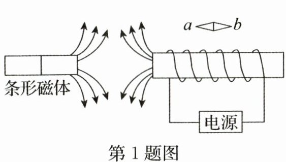 1. 条形磁体和通电螺线管之间磁感线的分布,以及小磁针静止时的情况如图所示,由此可以判断小磁针的$a$端为______极,电源的左端为______极。