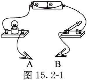 2. 小明用来鉴别导体与绝缘体的装置如图15.2-1所示,在金属夹A、B之间分别接入①硬币、②铅笔芯、③橡皮、④塑料尺等物体,闭合开关后,在A、B间接入