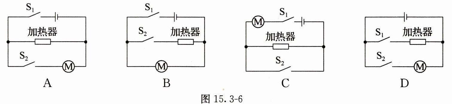 5. 某兴趣小组设计的带有烘干功能的滚筒洗衣机电路如图15.3-6所示。下列四种电路中,能满足洗衣和烘干功能独立进行的是(