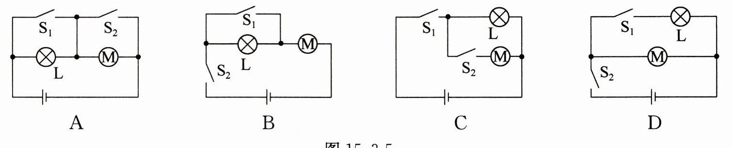 4. 有一种智能锁,需要通过“密码+人脸”两次成功识别才能开锁。密码识别成功时仅$S_{1}$闭合,灯$L$发光,照亮人脸进行识别,但不开锁;人脸识别成功后$S_{2}$才会闭合,电动机$M$工作,开锁成功。图15.3-5所示的电路图中设计符合要求的是(