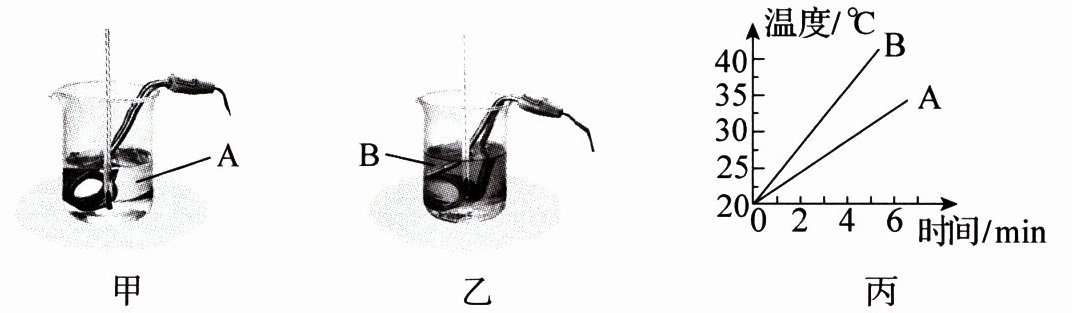 13. 为了探究不同物质的吸热情况与物质种类的关系,小强用两个规格相同的电加热器,分别给初温相同的A、B两种物质加热,实验装置如图13.1-3甲、乙所示。
