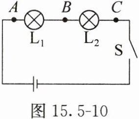 10. 小强将灯泡$L_{1}$、$L_{2}$串联在电路中,如图15.5-10所示,闭合开关S,他发现灯泡$L_{1}比L_{2}$更亮。他猜想可能有以下两个原因。