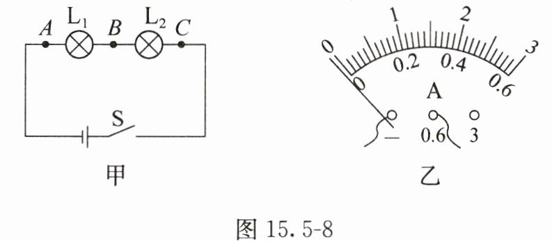 (选填“串”或“并”)联接入所测电路中。(2)连接电路,把电流表接入电路中的A点,闭合开关,发现电流表的指针如图15.5-8乙所示,出现这种故障的原因是