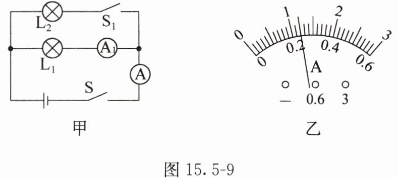 9. 图15.5-9甲所示电路中,闭合开关S和$S_{1}$,两个电流表指针偏转均如图15.5-9乙所示,则通过两个小灯泡的电流分别为多少?