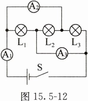 12. 如图15.5-12所示的电路中,电源电压恒定,开关S闭合后,电流表$A_{1}$、$A_{2}$、$A_{3}$的示数分别为2.2A、1.2A、1.5A。求通过小灯泡$L_{1}$、$L_{2}$、$L_{3}的电流I_{1}$、$I_{2}$、$I_{3}$。