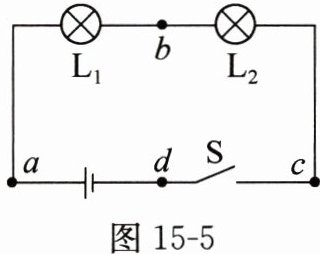 5. (青海中考)如图 15 - 5 所示,开关$ S $闭合后,小灯泡$ L_{1} $、$ L_{2} $都不亮,用一段导线的两端分别接触$ a $、$ b $两点时两小灯泡都不亮;分别接触$ b $、$ c $两点时,两小灯泡也不亮;分别接触$ c $、$ d $两点时,两小灯泡都亮。对此,下列判断中可能正确的是(