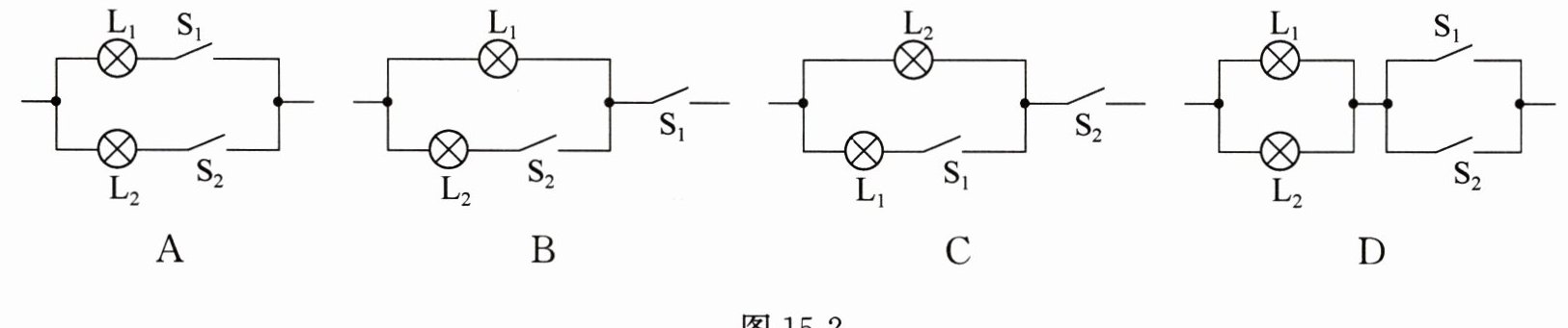 2. (安徽中考)老师给小龙一个密封盒,其表面可见两个开关$ S_{1} $、$ S_{2} $和两盏灯$ L_{1} $、$ L_{2} $。为了探究开关和灯在密封盒内是如何连接的,小龙进行了如下操作:先闭合$ S_{1} $,只有灯$ L_{1} $发光;又闭合$ S_{2} $,两灯都发光;最后断开$ S_{1} $,两灯都熄灭。图 15 - 2 中符合上述实验结果的连接方式为(