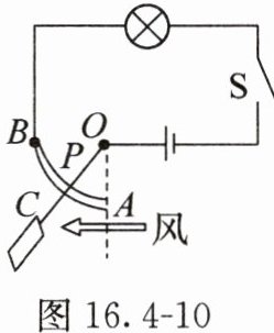 10. 一位同学设计了一个风力测定仪,如图16.4 - 10所示,O是转动轴,OC是金属杆,下面连接着一块受风板。无风时OC是竖直的,风越强,OC杆偏转的角度越大。AB是一段圆弧形电阻器,P点是金属杆与圆弧形电阻器相接触的点。电路中接有一个小灯泡,测风力时,闭合开关S即可。通过分析可知,金属杆OC与弧形电阻器AB组合在一起相当于一个