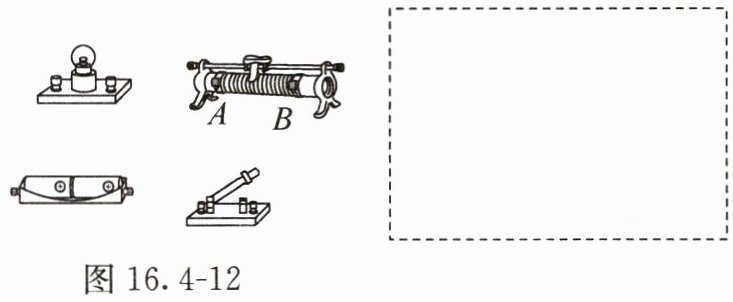 (1)请用笔画线表示导线,将图16.4 - 12中的元器件连接起来,要求:向B端移动滑动变阻器的滑片时,小灯泡变亮;导线不交叉。