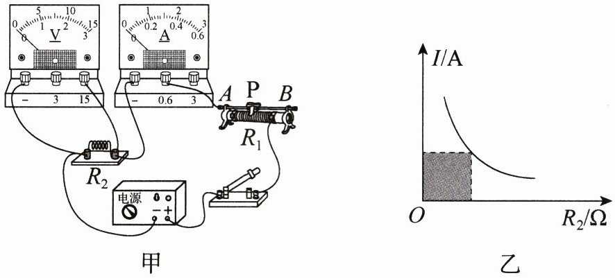 。(2)小桃绘制的电流I与定值电阻的电阻$R_2$的关系图像如图17.1-7乙所示。研究发现由图线上任一点和坐标轴围成的矩形(阴影部分)的面积大小都相等,由此得到的结论是