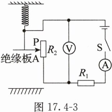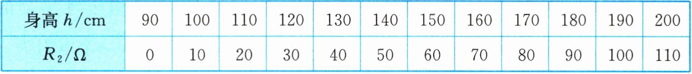 8. 一款电子身高测量仪的简化电路如图17.4-3所示,绝缘板$A与滑动变阻器的滑片P$固定在一起,且同步上下移动,滑动变阻器接入电路的电阻$R_{2}$与被测者身高的对应关系如表格所示。电源电压为$18V$,定值电阻的电阻$R_{1}= 20Ω$,滑动变阻器的规格为“$150Ω$ $1A$”,电压表的测量范围为$0~15V$,电流表的测量范围为$0~0.6A$。若将电流表或电压表改装为身高显示仪,则被测者的身高越高,电压表的示数______(选填“越大”“越小”或“不变”);当被测者的身高为$160cm$时,电流表的示数为______$A$,为保证电路安全工作,此测量仪测量的身高范围是______$cm$。