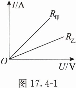 6. (多选)材料和长度均相同的两根金属丝甲、乙的横截面积分别为$S_{甲}$、$S_{乙}$,电阻分别为$R_{甲}$、$R_{乙}$,它们的$I-U$图像如图17.4-1所示。将甲、乙串联在电路中,通过它们的电流分别为$I_{甲}$、$I_{乙}$,它们两端的电压分别为$U_{甲}$、$U_{乙}$,则下列判断正确的是(