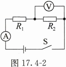 7. 如图17.4-2所示的电路中,电源两端的电压保持不变,一个定值电阻的电阻$R_{1}为10Ω$,当开关$S$闭合后,电压表的示数为$2V$,电流表的示数为$0.4A$。求: