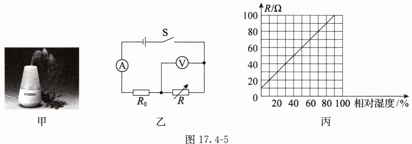 10. 一个超声波加湿器如图17.4-5甲所示,其内部相对湿度监测装置的简化电路如图17.4-5乙所示。已知电源电压为$12V$,定值电阻的电阻$R_{0}为20Ω$,电压表的测量范围为$0~9V$,湿敏电阻的电阻$R$随相对湿度变化的关系图像如图17.4-5丙所示。在电路安全工作的前提下,求: