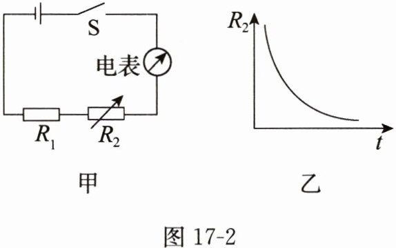 2. (湖南长沙中考)(多选)小明有一个可以显示水温的“智能水杯”。为了研究“智能水杯”内部的电路,老师准备了恒压电源、开关、导线若干、电阻为$R_{1}$的定值电阻、电阻为$R_{2}$的热敏电阻、电流表和电压表,小明在其中选择部分器材设计了如图 17 - 2 甲所示的电路来模拟“智能水杯”的功能。其中热敏电阻的电阻$R_{2}随温度t$的变化关系如图 17 - 2 乙所示,图中电表的示数可以反映温度的高低。开关闭合后,关于这个电路的说法正确的是(