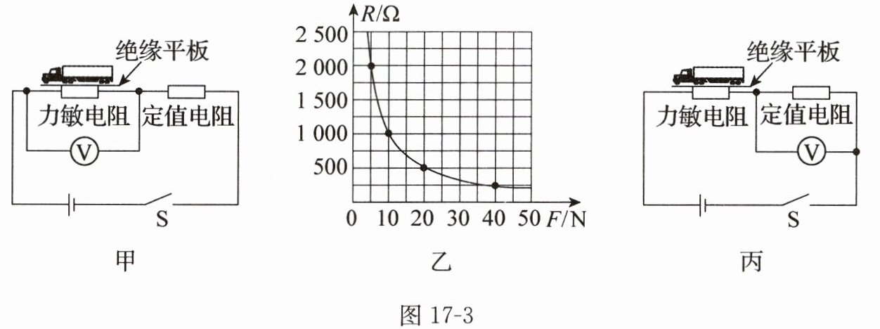 3. (湖南中考)超载存在安全隐患,交通部门常用“地磅”检测货车是否超载。小枫设计的模拟地磅原理的简化电路如图 17 - 3 甲所示,电源电压恒为$3\ V$,定值电阻规格可选,电压表的测量范围为$0~3\ V$,力敏电阻的电阻$R随所受压力F$的变化关系如图 17 - 3 乙所示。力敏电阻上方紧密连接一个轻质绝缘平板,检测时将货车模型静置于其上。$g取10\ N/kg$。